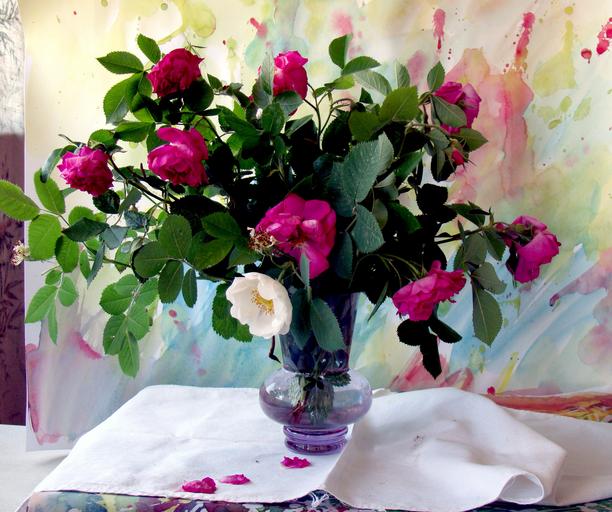 Keywords: bouquet flowers white pink vase still life drapery composition