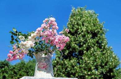 Keywords: bouquet of roses blossom bloom pink white bouquet rose pitcher