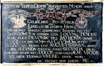 | Keywords: BourchierAnagramChronogramEpigram1623TawstockDevon.JPG Inscribed tablet on base of monument to William Bourchier 3rd Earl of Bath d 1623 St Peter's Church Tawstock Devon It comprises separate elements of anagram chronogram and epigram Top Bathon i ae Com i ti Devonae praefecto memoriae ergo To the memory of the Earl of Bath therefore to the prefect i e Lord Lieutenant of Devon Beneath this line is in the centre an inscribed skull and crossbones with to its left the image of a phoenix rising from a fire above which is Morior Orior I am dead I shall arise above which is inscribed on a scroll the well-known Roman epithet Mors mihi lucrum Death to me is reward On the right side of the skull is an image of a circular dial inscribed around the circumference with the first two letters of the 12 months of the year The top-most month which is crowned is IV i e JU for July the month of his death Above is inscribed Finis Coronat the end crowns above which is inscribed on a scroll the French motto of Bourchier Bon temps viendra The right time will come Within the skull is written on the top line grama to which word three other words point from above the skull ana- chrono- and epi- all Greek words in Latin form These denote to the reader the presence of anagrams chronograms epigrams and other puzzles within the tablet In the skull below the word grama are the two Latin words se and pul and on the two bones which intersect behind the skull are written 4 more Latin words ad in tum and crum which may all be combined together to form the sentences in sepulcrum ad sepultum into the grave in order to be buried or in sepultum ad se pulcrum in the act of burial one's-self is made beautiful Below is the anagram on the top line the words Gulielmus Bourchier William Bourchier below which is the indicator ana- and the name's Latin anagram Luge si ob lucrum heri mourn if on account of the profit of yesterday Below is a Latin epigram with some words in capitals which may relate to a chronogram or other word-game Quid sibi vult tumulus quidve haec insignia luctus est comes in superos ecce locumo tenens quare fles Devonia vel Bathonia quare If you wish to know what is this pile or why this great mourning the Earl behold is above as place-holder lieutenant as weeps Devon and Bath Below is a chronogram eXIIt en bon teMps nVnCo VIenDra patet exiit en bon temps nunc o viendra patet a mixture of limited sense in Latin and the French motto of Bourchier meaning he went in good time now he shall come he seeks When the capital Roman numerals are added together individually they make 1 623 the year of his death Underneath is a further possibly criptic epigram with some words in capitals Julius hoc mensis fuit Augustissimus anno atq ue secunda decem junge secunda dies non amor invidia est dolor euge lege alme viator et disce exemplo vivere disce more sic cecivit cecidit not elevit translated as The month of July was the most august in this year and the following day is hatred not love well-done read O Traveller and teach by his example how to live teach how to die thus he has falled he has not arisen At the end are two monograms R E and AR own photo 2013 Lobsterthermidor <span class signature-talk >talk</span> 18 13 26 March 2013 UTC St Peter's Church Tawstock interior Chronograms in writing in England PD-old-100 Earls of Bath |