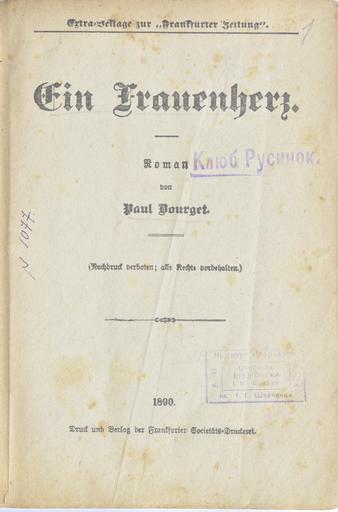 | Keywords: Bourget Woman's heart 1237.jpg Бу же Жіноче Се це Ф анкфу т-на- айні 1890 Титульний а куш З особистої бібліотеки І Ф анка Paul Bourget Woman's_heart Frankfurt am Main 1890 Title page From Ivan Franko personal Library 1890 Institution Shevchenko Institute of Literature Digital Collection PD-old-70-1923 Paul Bourget Book covers from Germany 1890 books from Germany 1790 books from Germany Franko Personal Library Collections of books in libraries in Ukraine Shevchenko Institute of Literature Uploaded with VicuñaUploader |