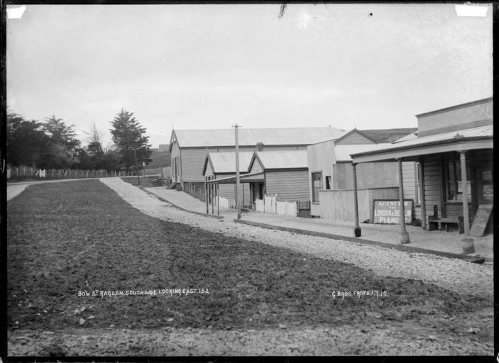 | Keywords: blackandwhite monochrome outdoor building architecture black and white View along Bow Street, Raglan, from the south side looking east, photographed in 1910, probably by Gilmour Brothers Store, Raglan (Robert Gilmour, proprietor). A board advertising "Agent for London & Berlin Piano Co." is visible centre right. Inscriptions: Inscribed - Photographer's title on negative -bottom left: Bow St. Raglan. Southside looking east. 152bottom right: G Bros Protd 1.7.10. Quantity: 1 b&w original negative(s). Physical Description: Dry plate glass negative 4.5 x 6.5 inches Gilmour Brothers (Firm). Bow Street, Raglan, southside looking east, 1910 - Photograph taken by Gilmour Brothers. Price, William Archer, 1866-1948 :Collection of post card negatives. Ref: 1/2-000318-G. Alexander Turnbull Library, Wellington, New Zealand. natlib.govt.nz/records/23040670 View along Bow Street, Raglan, from the south side looking east, photographed in 1910, probably by Gilmour Brothers Store, Raglan (Robert Gilmour, proprietor). A board advertising "Agent for London & Berlin Piano Co." is visible centre right. Inscriptions: Inscribed - Photographer's title on negative -bottom left: Bow St. Raglan. Southside looking east. 152bottom right: G Bros Protd 1.7.10. Quantity: 1 b&w original negative(s). Physical Description: Dry plate glass negative 4.5 x 6.5 inches Gilmour Brothers (Firm). Bow Street, Raglan, southside looking east, 1910 - Photograph taken by Gilmour Brothers. Price, William Archer, 1866-1948 :Collection of post card negatives. Ref: 1/2-000318-G. Alexander Turnbull Library, Wellington, New Zealand. natlib.govt.nz/records/23040670 |