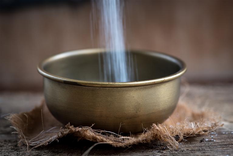 Keywords: bowl brass bowl brass vessel old antique used a trickle fill sugar trickle in motion close food-photography