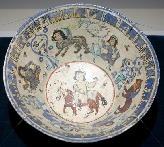 Keywords: Bowl with design of equestrian figure, Iran, Minai type, 13th century AD, enamelled ware pottery - Matsuoka Museum of Art - Tokyo, Japan - DSC07251.JPG en Exhibit in the Matsuoka Museum of Art - 5 Chome-12-6 Shirokanedai Minato Tokyo 108-0071 Japan 2015-02-20 00 22 05 own Daderot other versions PD-old-100 cc-zero Ceramics of Iran in the Matsuoka Museum of Art Mina'i ware |