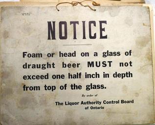 | Keywords: 1940s beer signs "L.A.C.B. No. 1. 7M. 24-7-45 NOTICE Foam or head on a glass of draught beer MUST not exceed one half inch in depth from top of the glass. By order of The Liquor Authority Control Board of Ontario" The Liquor Authority Control Board of Ontario was in operation between 1944 and 1947. The reference number on this notice suggests that it dates from July 1945. "L.A.C.B. No. 1. 7M. 24-7-45 NOTICE Foam or head on a glass of draught beer MUST not exceed one half inch in depth from top of the glass. By order of The Liquor Authority Control Board of Ontario" The Liquor Authority Control Board of Ontario was in operation between 1944 and 1947. The reference number on this notice suggests that it dates from July 1945. |