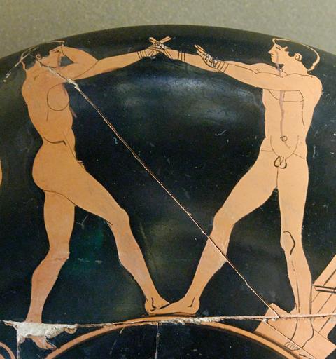 | Keywords: Boxing scene Louvre G384.jpg Painter of London E 80 Boxing scene athletes in guard position Detail from an Attic red-figure cup ca 470 BC Found in Vulci Scène de pugilat les deux adversaires en garde Détail d'une coupe attique à figures rouges vers 470 av J -C Provenance Vulci ca 470 BC red-figure ceramic cm 8 2 23 1 30 Institution Louvre object department Greek Etruscan and Roman antiquities room ID 26 5889 object history ProvenanceEvent excavation Vulci Charles Hippolyte de Paravey credit line ProvenanceEvent purchase 1879 accession number Louvre number 384 own photo date 2008 User Jastrow/cc-by-2 5 artwork license PD-old-100 photo license Cc-by-2 5 other versions Kylixes in France Painter of London E 80 Paravey Collection Greek antiquities in the Louvre - Room 39 Ancient Greek boxing Athletes in ancient Greek pottery 470s BC pottery in France Paris Ephebes Nude males in ancient Greek pottery |