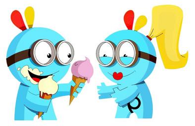 Keywords: boy caring cartoon characters critters cute female friendship girl ice cream male mutual affection non-human beings sharing