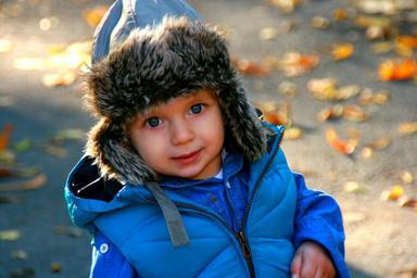 Keywords: boy child smile blue eyes autumn leaf yellow blue hat baby