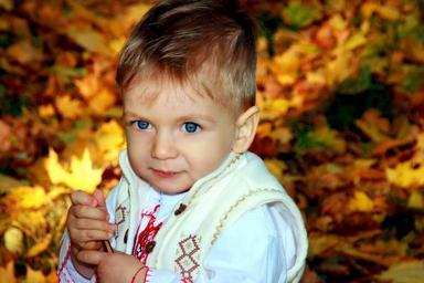 Keywords: boy child smile blue eyes autumn leaf yellow baby