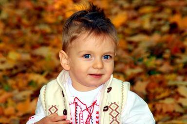 Keywords: boy child smile blue eyes autumn leaf yellow baby