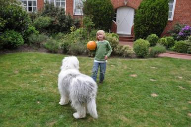 Keywords: boy dog ball cute bobtail child young fellig play fun front yard garden meadow ball game