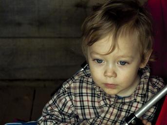Keywords: boy kid cute baby blue eyes stroller serious dark plaid flannel face portrait sad concerned