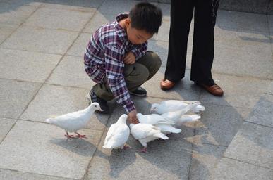 Keywords: boy pigeons bird feed feeding park