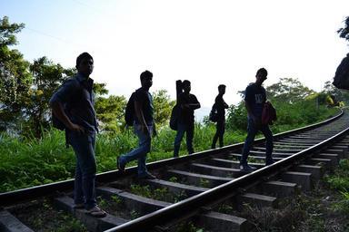 Keywords: boys band guitar guitarist rail road sky trees people pose posing men transport train rail
