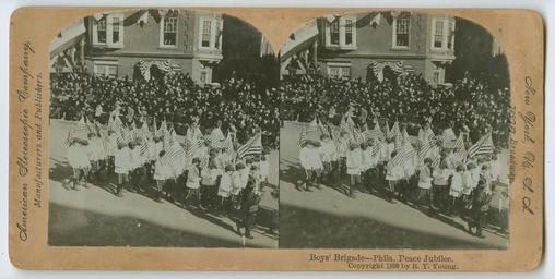 | Keywords: stereographs philadelphia peace jubilee peacejubilee spanish-american war spanishamericanwar boys' brigade boysbrigade children parades Shows the Boys' Brigade marching in the Philadelphia Peace Jubilee parade, 1898. The boys wear military-style uniforms and carry American flags. A crowd watches from the sidewalk in front of a building, in which two women watch from a window . The jubilee celebrated the end of the Spanish-American War. Accession number: P.2011.47.1532 Shows the Boys' Brigade marching in the Philadelphia Peace Jubilee parade, 1898. The boys wear military-style uniforms and carry American flags. A crowd watches from the sidewalk in front of a building, in which two women watch from a window . The jubilee celebrated the end of the Spanish-American War. Accession number: P.2011.47.1532 |