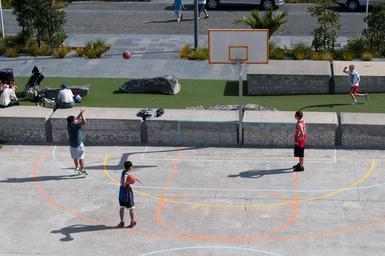 | Keywords: auckland new zealand newzealand outdoor sport court game Three boys practicing basketball on a court near Silo Park, Auckland. The boy at right is shooting while the other two look on. Another boy is running towards them at right. Two men are seated at upper left. All have long shadows projecting to left of frame. Three boys practicing basketball on a court near Silo Park, Auckland. The boy at right is shooting while the other two look on. Another boy is running towards them at right. Two men are seated at upper left. All have long shadows projecting to left of frame. |