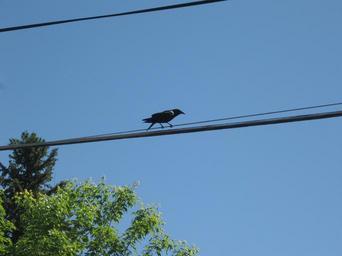 Keywords: Bozeman crow on a wire.JPG en American Crow in Bozeman Montana own Remnoza 2008 Corvus brachyrhynchos