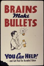 | Keywords: Brains Make Bullets. You Can Help^ - NARA - 534246.jpg Scope and content General notes 534246 Local identifier 179-WP-397 Office for Emergency Management War Production Board 01/1942 - 11/03/1945 Still Picture Records Section Special Media Archives Services Division NWCS-S National Archives at College Park 8601 Adelphi Road College Park MD 20740-6001 other date circa 1942 1943 Record group Record Group 179 Records of the War Production Board 1918 - 1947 Record group ARC 508 War Production Board compiled 1942 - 1943 Series ARC 533858 File unit File unit ARC Variant control numbers NAIL Control Number NWDNS-179-WP-397 Other versions <gallery> File Brains_Make_Bullets _You_Can_Help _-_NARA_-_534246 tif tif File Brains_Make_Bullets _You_Can_Help _-_NARA_-_534246 jpg jpg </gallery> NARA-cooperation PD-USGov World War II posters from the United States |
