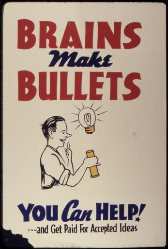 Keywords: Brains Make Bullets. You Can Help^ - NARA - 534246.jpg Scope and content General notes 534246 Local identifier 179-WP-397 Office for Emergency Management War Production Board 01/1942 - 11/03/1945 Still Picture Records Section Special Media Archives Services Division NWCS-S National Archives at College Park 8601 Adelphi Road College Park MD 20740-6001 other date circa 1942 1943 Record group Record Group 179 Records of the War Production Board 1918 - 1947 Record group ARC 508 War Production Board compiled 1942 - 1943 Series ARC 533858 File unit File unit ARC Variant control numbers NAIL Control Number NWDNS-179-WP-397 Other versions <gallery> File Brains_Make_Bullets _You_Can_Help _-_NARA_-_534246 tif tif File Brains_Make_Bullets _You_Can_Help _-_NARA_-_534246 jpg jpg </gallery> NARA-cooperation PD-USGov World War II posters from the United States |