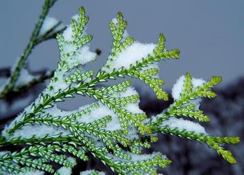 Keywords: branch green winter plant snow periwinkle close harmonious