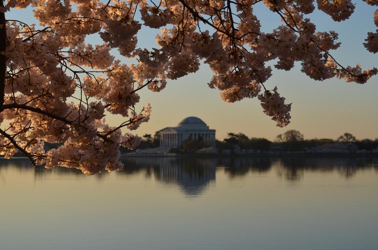 Keywords: branches fruit tree full bloom blossoms white pink spring season view architecture building theatre opera greek style lake water glassy mirror reflection columns