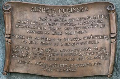 | Keywords: Bratislava park hradneho nadvoria.jpg sk V párku hradného nadvoria bratislavského hradu je bronzová plastina Alžbety Durínskej-Uhorskej Na podstavci sochy je bronzová informačná tabuľa own Peter Zelizňák 12 júna 2009 Own work all rights released Public domain Plaques in Bratislava Images by Peter Zeliznak Self-published work |