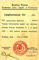 | Keywords: BratniaPomoc1945.jpg pl zaświadczenie o uczestnictwie w tajnym nauczaniu na UJ podczas okupacji niemieckiej i o przynależności w tym czasie do Bratniej Pomocy Archiwum domowe home archive <br>Skan osoby przesyłającej scanned by uploader Julo 1945-03-19 PD-ineligible Julo Henryk Zieliński Historical documents of the Jagiellonian University 1945 in Poland |