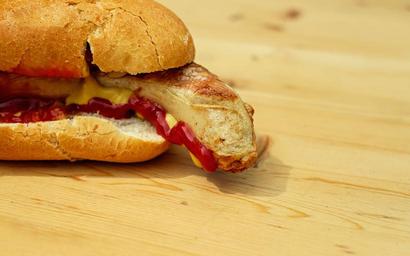 Keywords: bratwurst sausage white roll mustard ketchup market sausage