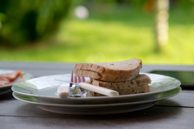 Keywords: bread snack breakfast garden plate cutlery knife fork homemade vespers eat loaf crispy frisch hunger break bauernbrote substantial food