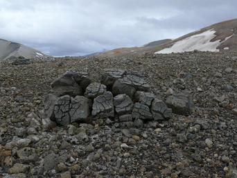 | Keywords: valley of ten thousand smokes valleyoftenthousandsmokes outdoor rock According to the USGS, "A breadcrust bomb is a volcanic bomb with a cracked and checkered surface, sometimes resembling the surface of a loaf of bread. The cracks develop when the outer surface of a partially molten lava fragment cools to form a brittle surface and then subsequently cracks as the hot interior expands due to the continued growth of gas bubbles." This bomb has been broken by frost wedging. NPS photo by M. Fitz. According to the USGS, "A breadcrust bomb is a volcanic bomb with a cracked and checkered surface, sometimes resembling the surface of a loaf of bread. The cracks develop when the outer surface of a partially molten lava fragment cools to form a brittle surface and then subsequently cracks as the hot interior expands due to the continued growth of gas bubbles." This bomb has been broken by frost wedging. NPS photo by M. Fitz. |