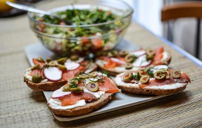 Keywords: breakfast salad healthy fresh food diet nutrition bowl vitamin colorful delicious variety vegetable meal salmon olives sandwich raw nutrient
