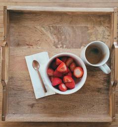 Keywords: breakfast tray strawberries cup morning coffee food bed room meal beverage luxury healthy wooden lifestyle comfortable life mug romantic copper spoon wood romance