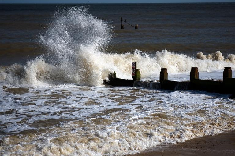 Keywords: breakwater north sea waves breakers shore beach sunlight southwold uk
