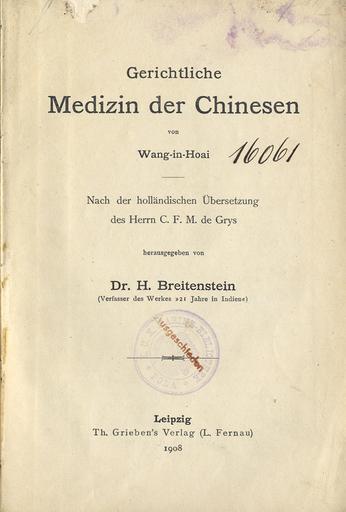 | Keywords: Breitenstein-Chinesische-Gerichtsmedizin-1908.jpg en German translation of Song Ci's book on forensic medicine the Xǐ yuān lù Washing Away of Wrongs 1247 de Deutsche bersetzung des von Song Cis 1247 publizierten Buchs über forensische Medizin Xǐ yuān lù Aufzeichnungen zur Tilgung von Ungerechtigkeit own WolfgangMichel 2014-12-28 1908 books Forensic medicine Translations History of China Cc-zero | ||||