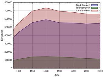 | Keywords: Bremen Einwohner.svg Freie Hansestadt Bremen<br/> gnuplot Skript für gnuplot <pre> reset data bremen_data txt name bremen_Einwohner type svg set terminal svg size 800 600 font Arial 14 set grid set key set style fill transparent solid 0 3 set style data filledcurves below x1 set mxtics 5 set mytics 5 set format y 0f set xrange 1946 2010 set xlabel Jahr set ylabel Einwohner set output name type plot data using 1 2 linewidth 2 lc rgb dark-blue title Stadt Bremen \ data using 1 3 linewidth 2 lc rgb dark-green title Bremerhaven \ data using 1 4 linewidth 2 lc rgb dark-red title Land Bremen unset output </pre> Datensatz nach Tabelle in Freie Hansestadt Bremen <pre> bremen_data txt JahrStadt B havenLand Bremen 1946 377696 97000 474696 1950 441025 113176 554201 1960 557461 140121 697582 1970 592533 142919 735452 1980 555118 138728 693846 1990 551219 130446 681665 2000 539403 120822 660225 2010 547340 113366 660706 </pre> own gnuplot mit Daten aus Freie Hansestadt Bremen 1 2012-03-23 Stefan Diskussion StefanPohl Original upload log de wikipedia Wdwdbot CommonsHelper de wikipedia Bremen+Einwohner svg 2012-03-23 08 18 StefanPohl 800×600× 17930 bytes <nowiki> Information Bevölkerungsentwicklung Freie Hansestadt Bremen selbst mit gnuplot mit Daten aus Freie Hansestadt Bremen ~~~ 23 03 2012 Ande ¦</nowiki> Bremen Bremerhaven Images with Gnuplot source code |