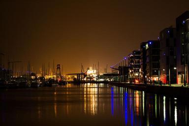 Keywords: bremerhafen lights water city evening dusk atmosphere mirroring abendstimmung
