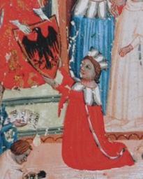 Keywords: Bretislav stit.jpg cs Břetislav získává od císaře štít s orlicí Dalimil chronik author century 14 PD-Art Chronik Dalimil Bretislaus I of Bohemia in miniature Coats of arms of Přemyslid family