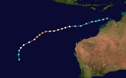 | Keywords: Brian 1980 track.png Track map of Severe Tropical Cyclone Brian of the 1979 “80 Australian region cyclone season The points show the location of the storm at 6-hour intervals The color represents the storm's maximum sustained wind speeds as classified in the Saffir-Simpson Hurricane Scale see below and the shape of the data points represent the nature of the storm according to the legend below User Nilfanion/Tc/T The background image is from NASA Tracking data is from http //jtwccdn appspot com/NOOC/nmfc-ph/RSS/jtwc/best_tracks/wpindex html JTWC 2013-06-08 Supportstorm Tropical cyclone tracks Australian region tropical cyclone tracks |