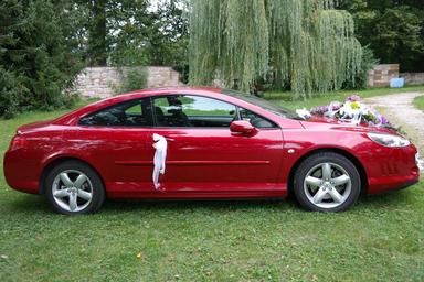 Keywords: bridal car wedding limousine spotlight flowers decoration auto red peugeot