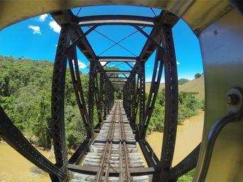 Keywords: bridge architecture tracks steel wood river trees