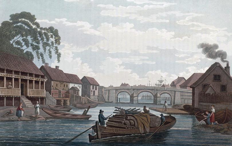 | Keywords: Bridge, at Christiania (JW Edy plate 52).jpg Artwork Creator John William Edy en Bridge at Christiania The bridge is the old Vaterland Bridge This engraving is also at display in the Christiana series at Norwegian Maritime Museum Oslo Norway No LII BRIDGE AT CHRISTIANIA The suburbs of Opsloe nearly join those of Christiania; the high road from Egeberg winding through them both and passing round the head of the bay and along the deal-yards leads over this bridge into the east quarter of Christiania It is the only way for carriages from the south of Norway and for travellers from Sweden Denmark c c Unfortunately it does not enter the most prepossessing part of the city the aspect of which however gradually improves as you approach the great church The bridge is handsomely and firmly built of stone having three arches supported by strong abutments The centre piers are well guarded by finn erections of wood to protect them from being injured by the vast quantity of timber floating down to the yards The flooring projects much on the sides under which are kept the public ladders and crooks used in cases of fire Above is a finn double rail painted white Below the bridge on the left the extensive deal-yards commence and on the right side the buildings of the city The source of the river is about Eans Fiord and near a small lake; there are several falls in its course which give motion to many saw-mills On its silvery surface are borne innumerable rafts and barges laden with the best timber which Norway produces The deals are assorted and stacked in the yards below the bridge and when properly seasoned they are conveyed thence in barges to the ships seen in the harbour below The point where this view was taken is situated a little way above the Bridge at a place called Grønland Greenland By the sides are a few prams and in the middle is a barge laden with several sorts of merchandise On the shores some women are seen washing in the river and beating the water out of the clothes with a mallet a method commonly practised by them instead of rubbing The house on the left hand is a tolerable specimen of the secondary dwellings in the country having a gallery around it over which projects the roof supported by upright posts The structure rests at its four angles on pillars of stone three or four feet above the surface of the earth to keep out vermin In the inclement winters the inhabitants close the apertures of the gallery between the uprights with boards or more generally with branches of fir-trees as an additional security against the cold northern blasts ; and at these seasons the houses present a singular feature in the landscape A considerable traffic is carried on by the numerous shopkeepers in the streets leading from this part of Christiania to the country consequently the number of persons traversing this the only bridge must amount to thousands daily especially when it is recollected that the town contains a population of 10 000 exclusive of country dealers and visitors Collapse bottom http //urn nb no/URN NBN no-nb_digibok_2011072910001 Boydell's picturesque scenery of Norway London 1820 Plate no 52 p 281 in scanned copy 180px no-nb_digibok_2011072910001 PD-Art-100 John William Edy Boydell's picturesque scenery of Norway Vaterlands bro Oslo in art |