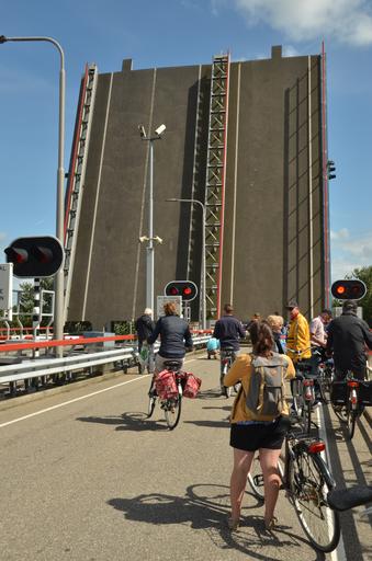 Keywords: bridge drawbridge shipping ship boat water wait bicycle cyclist