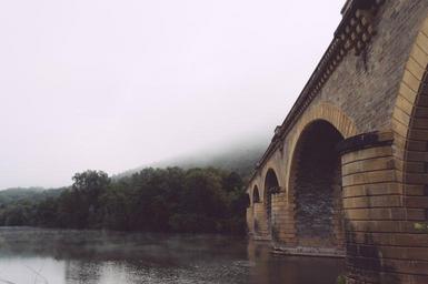Keywords: bridge historic arches river crossing stone landmark architecture water building infrastructure rainy weather structure