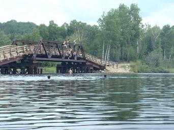 Keywords: bridge jump dive swim swimming teens fun algonquin canada ontario outdoor kids water landscape lake trees forest park sky