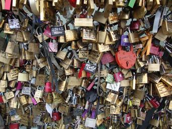 Keywords: bridge love padlock railing iron couples rust padlocks