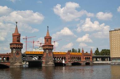 Keywords: bridge oberbaumbrücke river architecture city building monument historic preservation s bahn s bahn bridge district spree berlin capital germany crane cranes construction cranes towers clouded sky summer