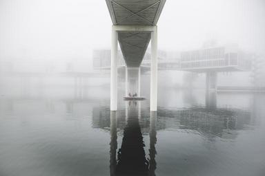 Keywords: bridge pier building structure construction metal steel modern contemporary architecture futuristic house office lake water foggy misty stilt house perspective boat refelction