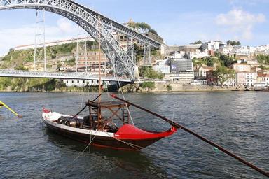 Keywords: bridge porto river douro wooden boat portugal vessel boat quiet