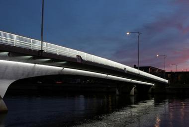 Keywords: bridge river water reflections finland sky clouds sunset dusk evening lights outside architecture