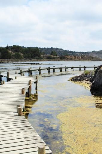 Keywords: bridge salins wooden bridge stilt sea peyriac france path atypical hiking passage sea water