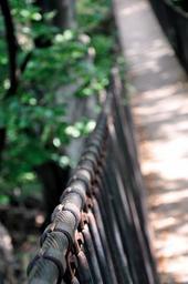 Keywords: bridge steel cable suspension bridge green brown web boards forest leaves landscape valley technology connection help